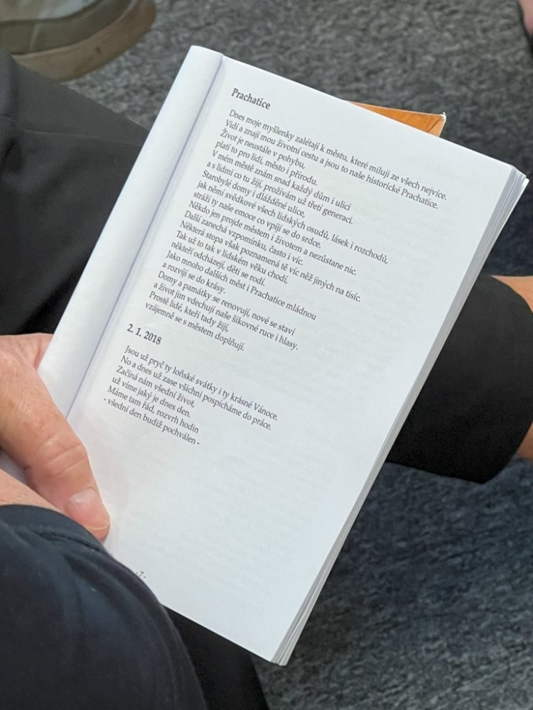 Nebyla to ale jediná ukázka. Přítomní si mohli vybírat i z dalších textů a s chutí se začetli do povídek Virtuální svět, Štěstí, Všelék heřmánek, či do vyprávění o Šumavě, Prachaticích, lásce, krásách života a dalších zastaveních, v nichž se prolíná bilancování, moudrost i radost ze života.
