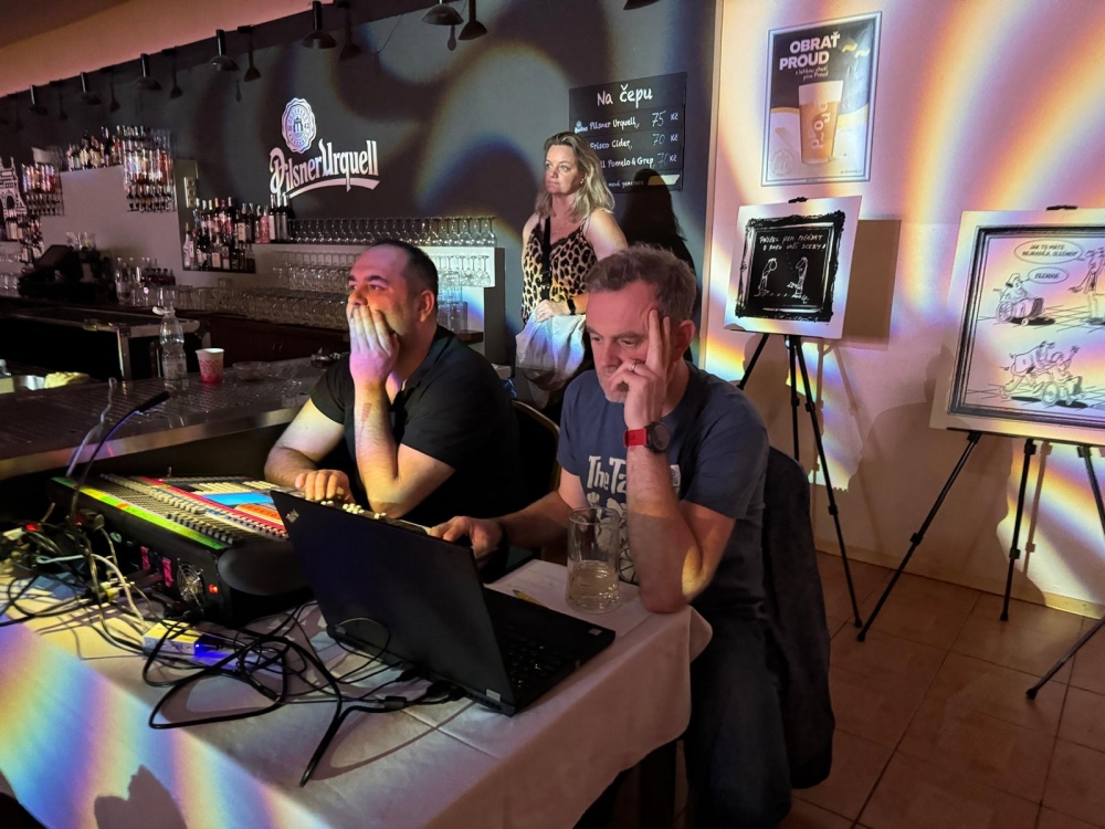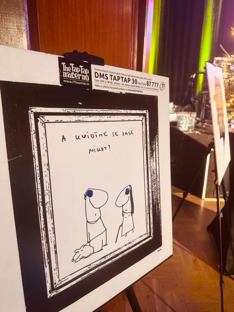Do sálu byla přesunuta výstava Černého humoru skupiny The Tap Tap, aby ji v zhlédlo co nejvíce účastníků, což se podařilo. Výstava předních českých malířů a karikaturistů vyvolala úsměv na rtech, a to jak u zdravých, tak u lidí s handicapem, celou atmosféru doplnil i vánoční strom který měl ozdoby pouze s logem skupiny a byl nádherným doplněním celého interiéru, který na stolech doplnily vánoční mísy se světly a s keramikou, které dodali klienti Chelčického domova sv. Linharta, za což také velmi děkujeme. Příležitost byla dána i seniorům a jejich výrobkům - nádherná dřevěná srdce, pro všechny muzikanty nebo perníčky či na pečené vánočky od dobrovolníků. Jeden z oslavenců dostal také nádherný dort.