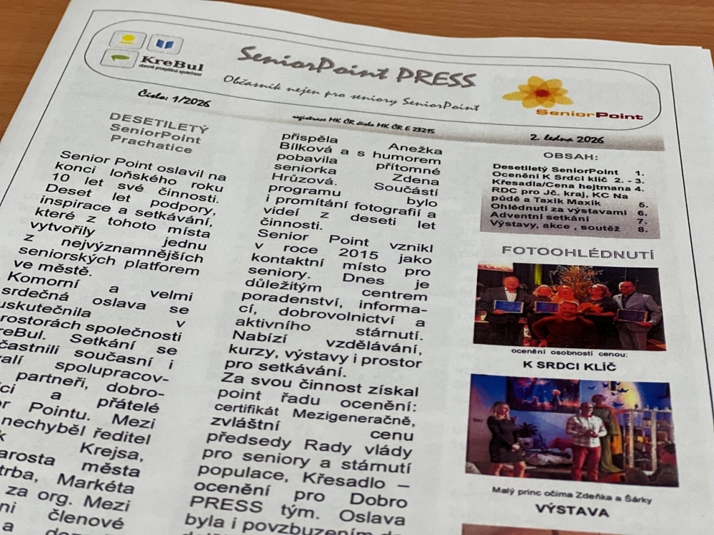 Vyšlo další číslo informačního občasníku SeniorPoint PRESS 1/2026, který je určen nejen seniorům, ale také osobám se zdravotním postižením, pečujícím a všem, kteří se zajímají o komunitní dění v Prachaticích. Bulletin sestavuje SeniorPoint Prachatice ve spolupráci s městem Prachatice. Aktuální číslo přináší pestrý obsah plný ohlédnutí, inspirativních příběhů, poděkování i pozvánek na nadcházející akce. A to jak v tištěné, tak zvukové podobě.
