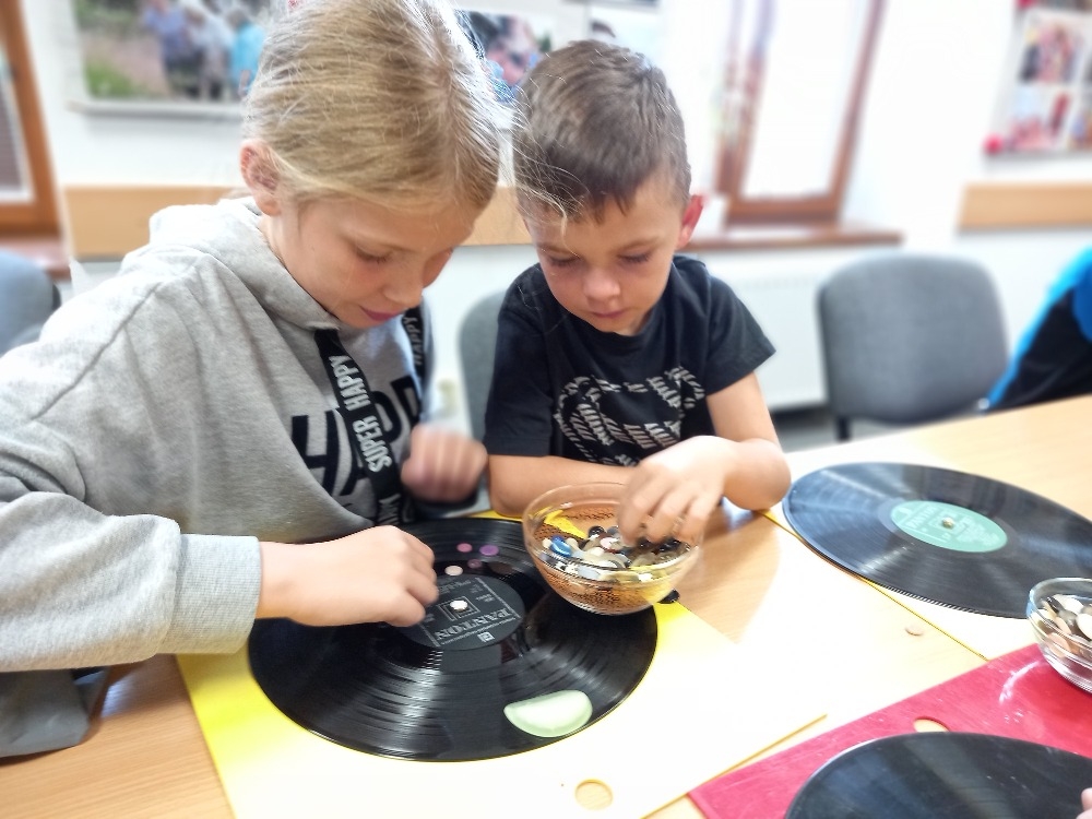 Celým táborem nás provázelo sbírání „céček“ – a to jako odměny za splněné úkoly, výhry v soutěžích, nebo slušné chování, které bylo v té době normou (děkuji, prosím, omlouvám se). Hned na úvod jsme se naučili pár pohybových her, jako je „Cukr, káva, limonáda“, nebo „Honzo, vstávej“. Cvrnkání kuliček jsme měli kvůli počasí v místnosti, ale i tak jsme se snažili všichni strefit do středu kruhu, jako by to byl důlek. S kruhem jsme pracovali i odpoledne – zdobili jsme gramofonovou desku knoflíčky. Přebírali jsme provázky a hráli s pavučinou, nebo vyráběli srdíčka z korálků.