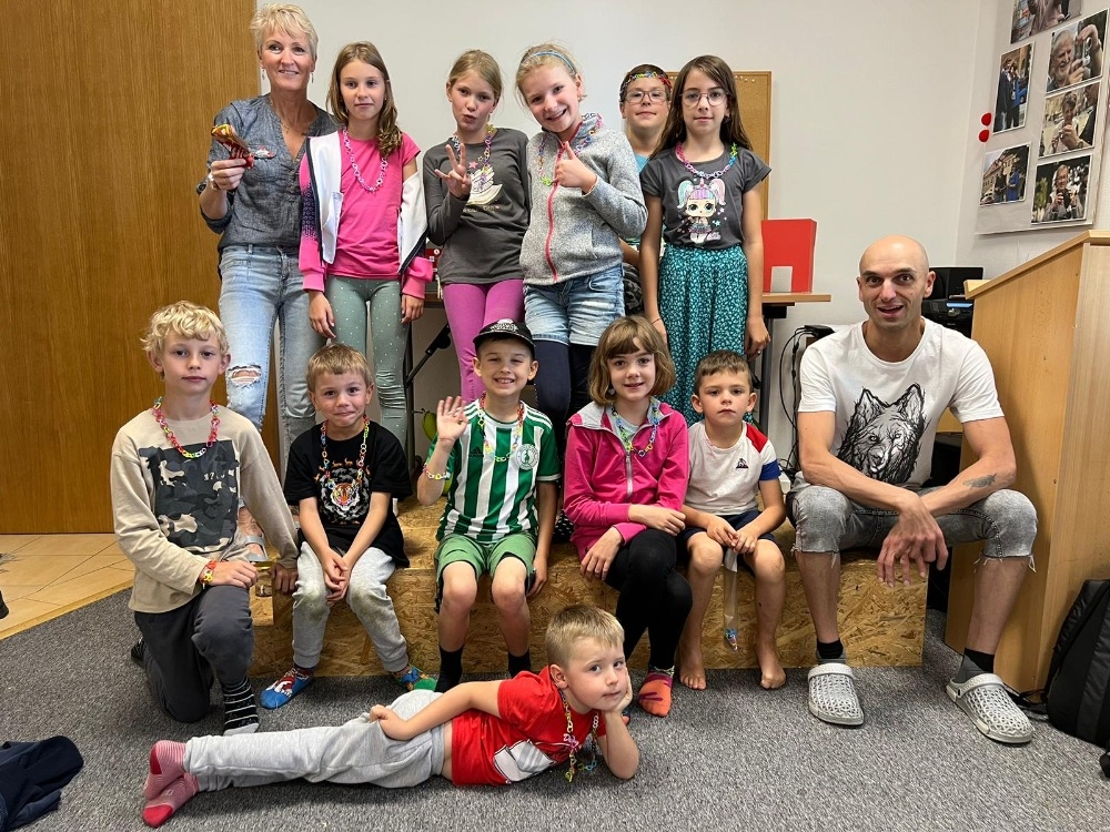 Jeden den jsme si hráli i tleskací hry: „Jak se tak dívám“, „Šly tři opice“, „Měl jsem ženu…“. Uspořádali jsme i olympiádu v „Kámen, nůžky, papír“, kde každý hrál s každým a vítěz si odnesl 5 céček! Ty jsme si samozřejmě odnesli domů – udělali jsme si náramky i korále. Spolu s diplomem jsme dostali i hodně odměn s logem města Prachatice. I my jsme předali diplom do Zdravé kuchyně Petra Stupky. Vařili tak dobře, že jsme si ani nemuseli utahovat opasky. Jo, a víte, že stále vyrábějí igráčky? Také jsme si s nimi hráli a odnesli domů. Mám od každého i obrázek v památníčku.