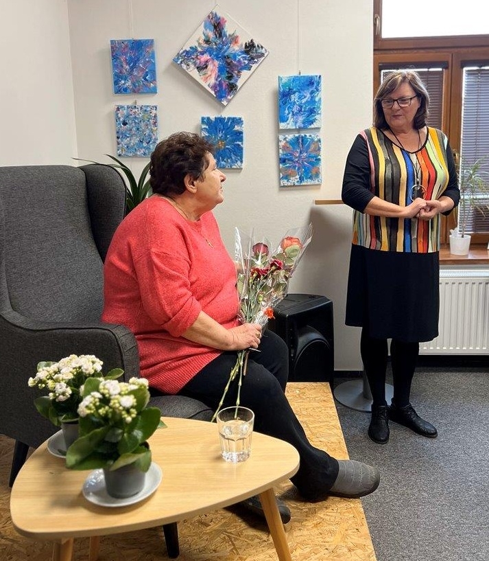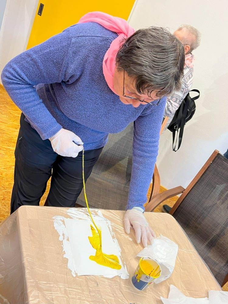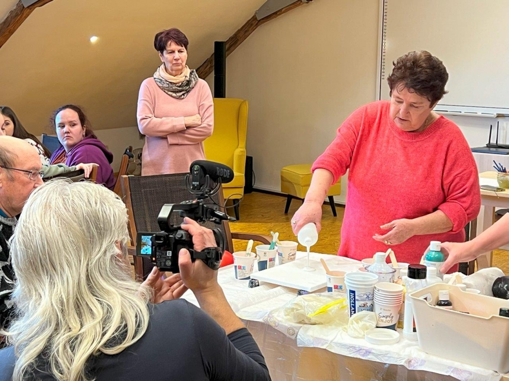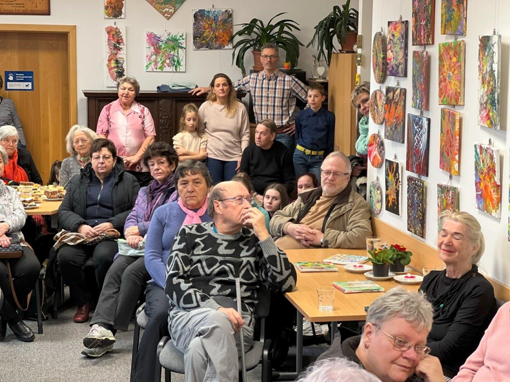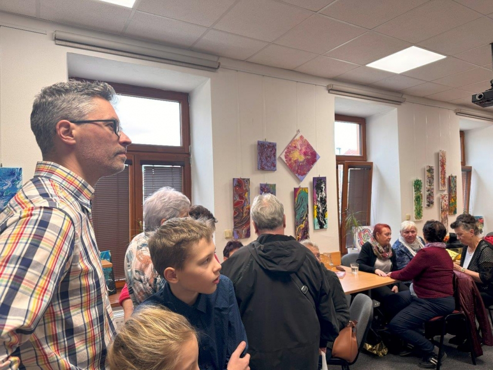 Jiřina Holánková, seniorka, začala malovat před rokem. 8.2.2024 byla otevřena její první autorská výstava obrázků, malovaných technikou acrylic pouring. Výstavu, vernisáž i výtvarnou dílnu připravil SeniorPoint Prachatice v Komunitním centru Na půdě v Prachaticích.