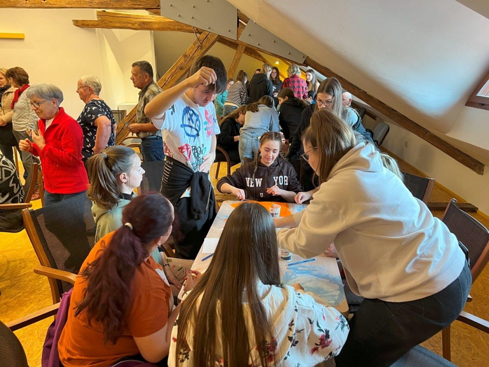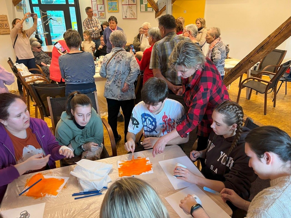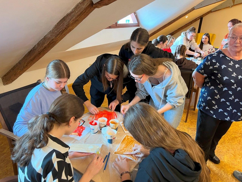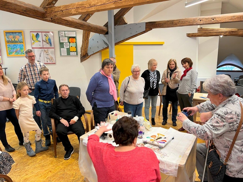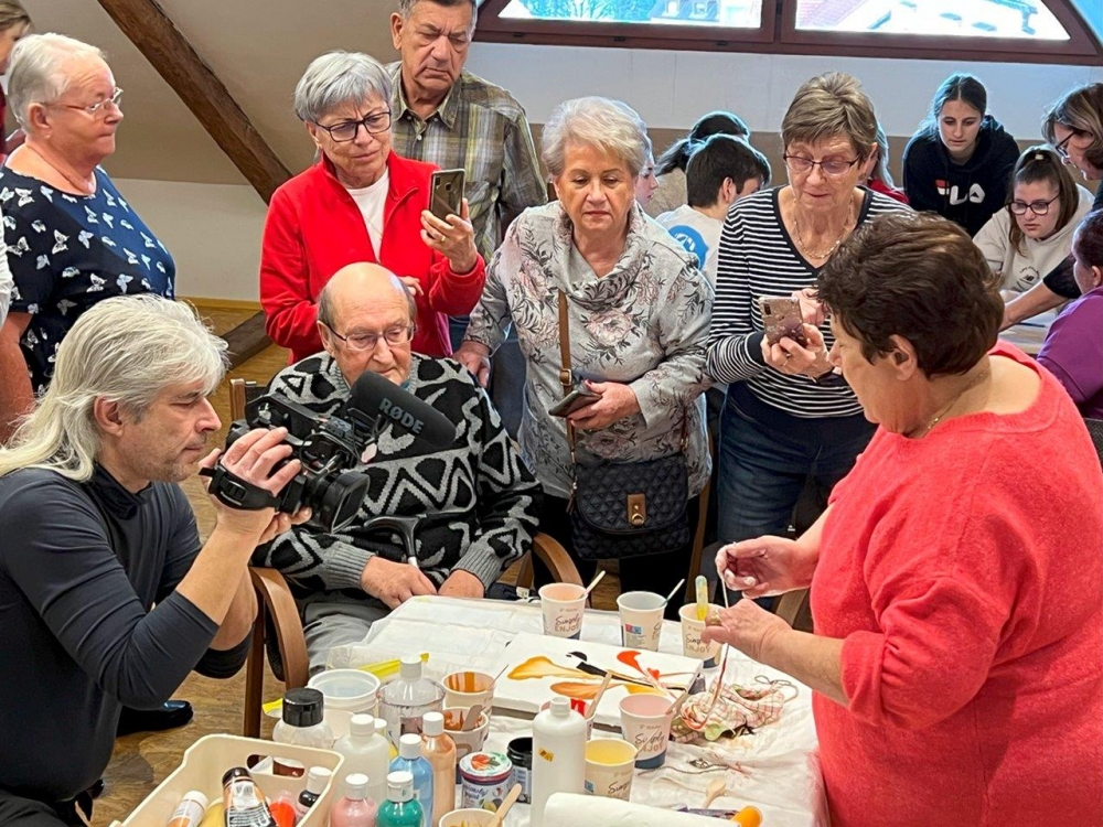 Při vernisáži zazněl zpěv Marie Šímové a Jarmily Šímové, vyslyšena byla krásná slova, následovala prohlídka. Pak již všichni účastníci a že jich bylo, byli pozváni o dvě patra výš do KC Na půdě, kde byla připravena „hnízda“ pro tvorbu danou technikou. Jiřina Holánková ukázala ředění, natírání, malování a používání pomůcek. Individuálně se věnovala jak seniorům, tak mladým lidem. Techniku konzultovala i s výtvarnicí Ivankou Bečvářovou, která přivedla na workshop studenty Střední pedagogické školy Prachatice.