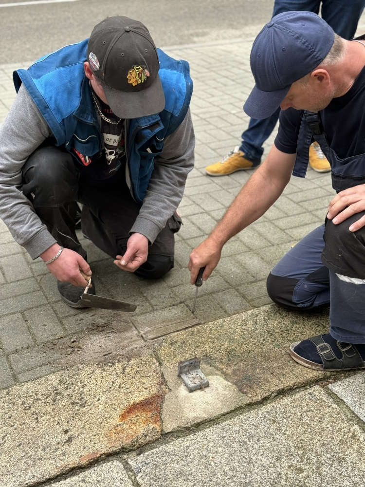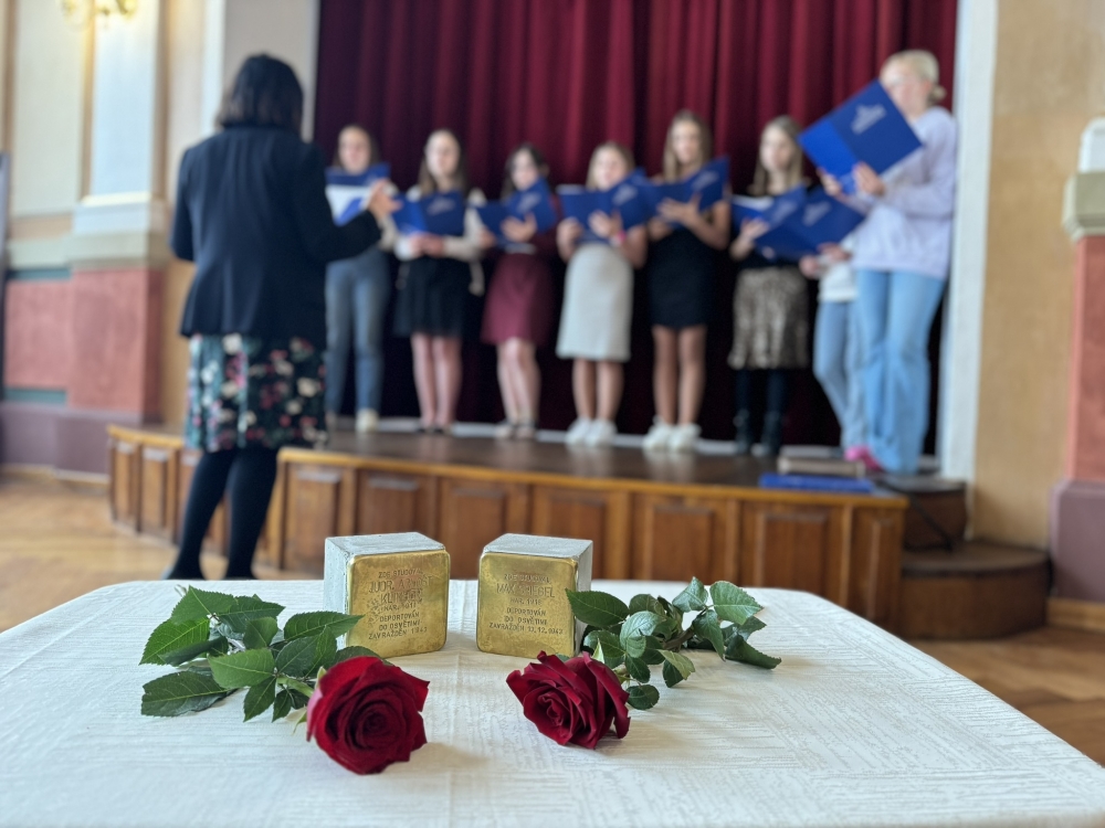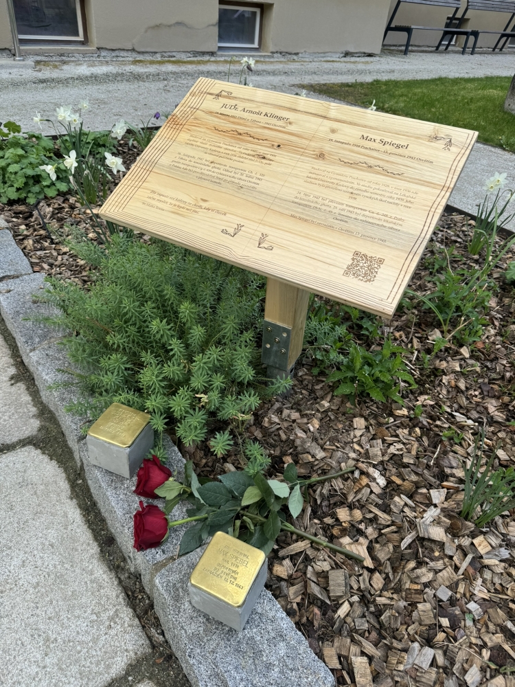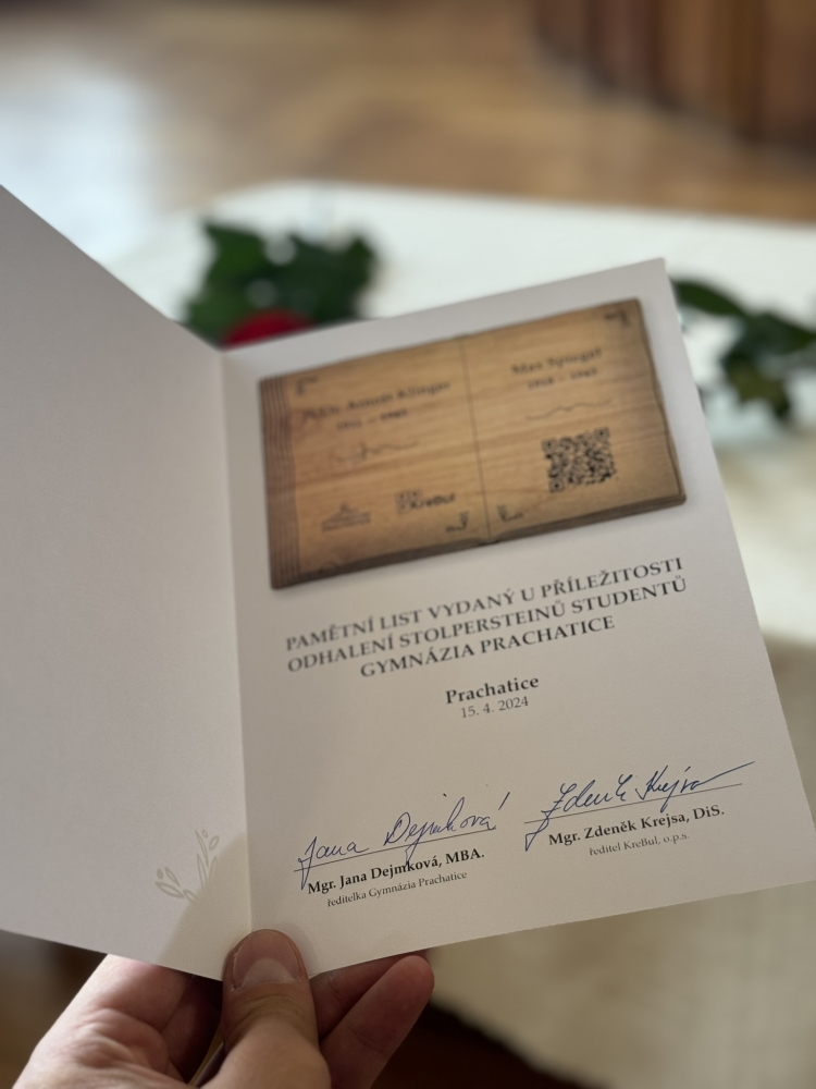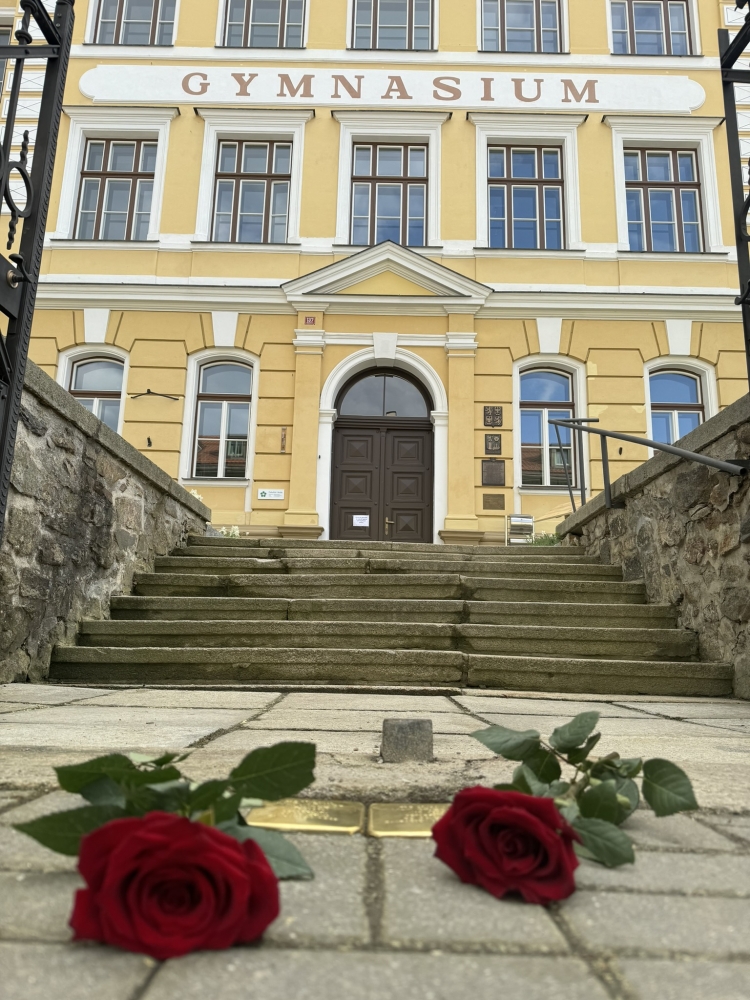 Na základě této iniciativy byly před budovou školy osazeny dva první stolpersteiny - kameny, o které se zakopává - v Prachaticích. Jejich význam objasnila ředitelka Nadačního fondu obětem holocaustu Marta Malá: „Z Talmudu vychází myšlenka, která říká, že člověk je zapomenut pouze tehdy, je-li zapomenuto jeho jméno. Proto jsem velmi ráda, že právě dnes odkrýváte dva kameny zmizelých a vracíte tak životní příběhy dvěma studentům školy,“ uzavřela. V zahradě školy pak byla umístěna vzpomínková deska s medailonky obou studentů.