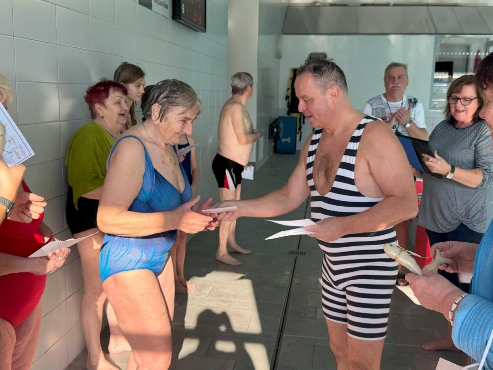 Závěrem všichni obdrželi diplomy, „zlaté rybičky“, mořskou sůl, ale také dvojice kyselé rybičky a nejúspěšnější i medaile. Ti, kteří přišli na zahájení navíc získali 5 vstupů zdarma na další plavání. Ostatní si hradí vstupy samostatně (i tak mají senioři v bazénu vstupné zlevněné) a všichni pak zapisují do připravených archů u pokladny své odplavané bazény.