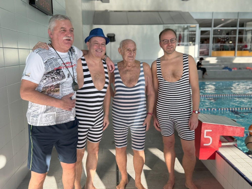 První skok do vody učinili pánové Bauer, Krejsa a Petráček. Nechyběl v retro plavkách ani Karel Hrůza, jeden z nejstarších účastníků, který kampaň nevynechal ani jednou (a to ani v době covidu, kdy se neplavalo – nesmělo se, ale chodilo se, a nachodil se svou paní i další partou lidí několik kilometrů).
